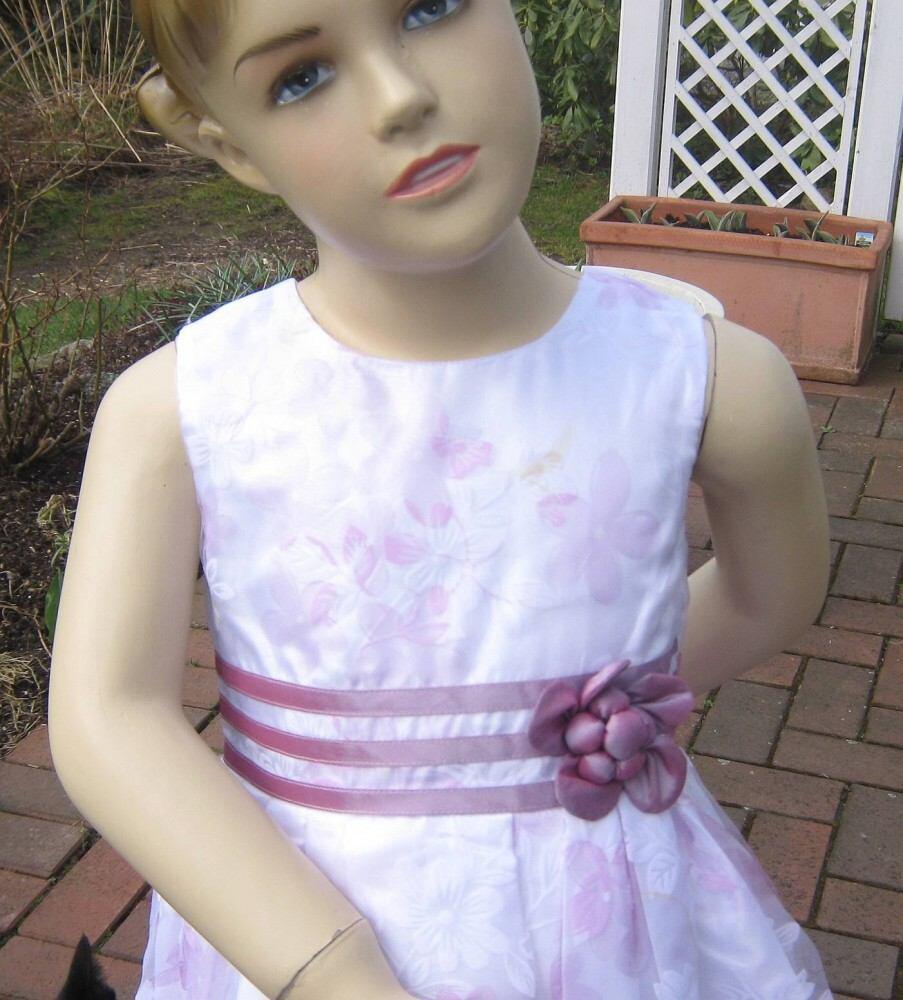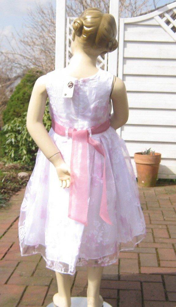 Der Oberstoff dieses zauberhaften Kinderkleides ist ein duftiger, weiß und rosa bedruckter Organza.