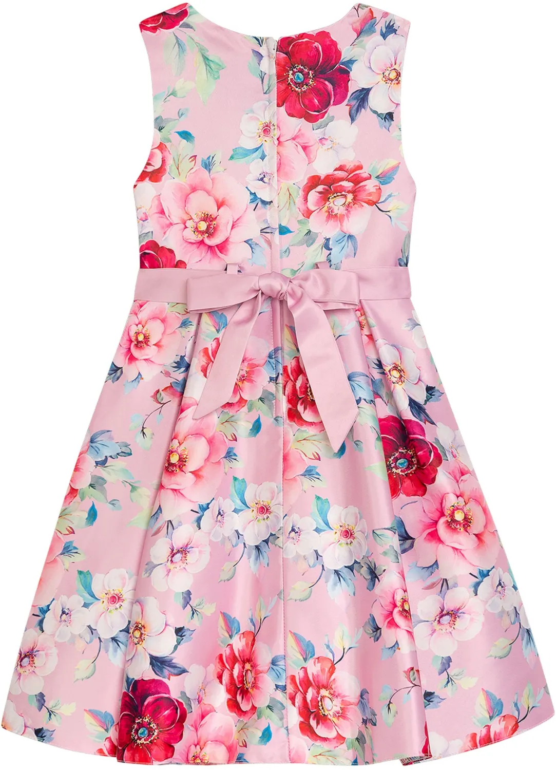 Ein klassisches Kinderkleid aus schimmerndem Satin mit wunderschönem Blumendruck.