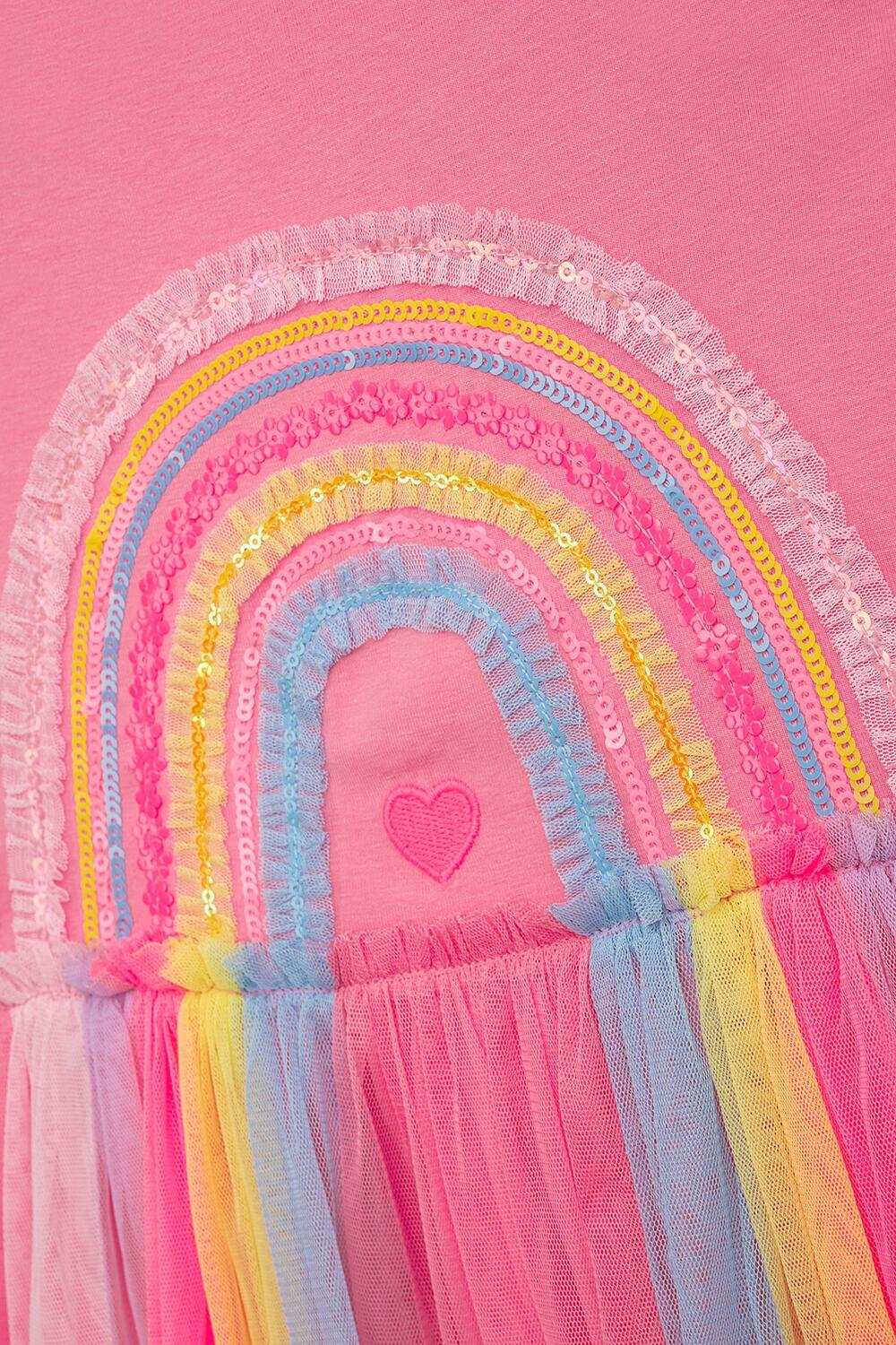 Das vordere, ungefütterte Oberteil ist mit einem Regenbogen aus Pailletten und Tüll dekoriert.