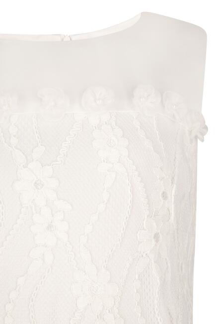 Das vordere Oberteil ist mit Tüllspitze überlegt, die auf dem Rock endet.