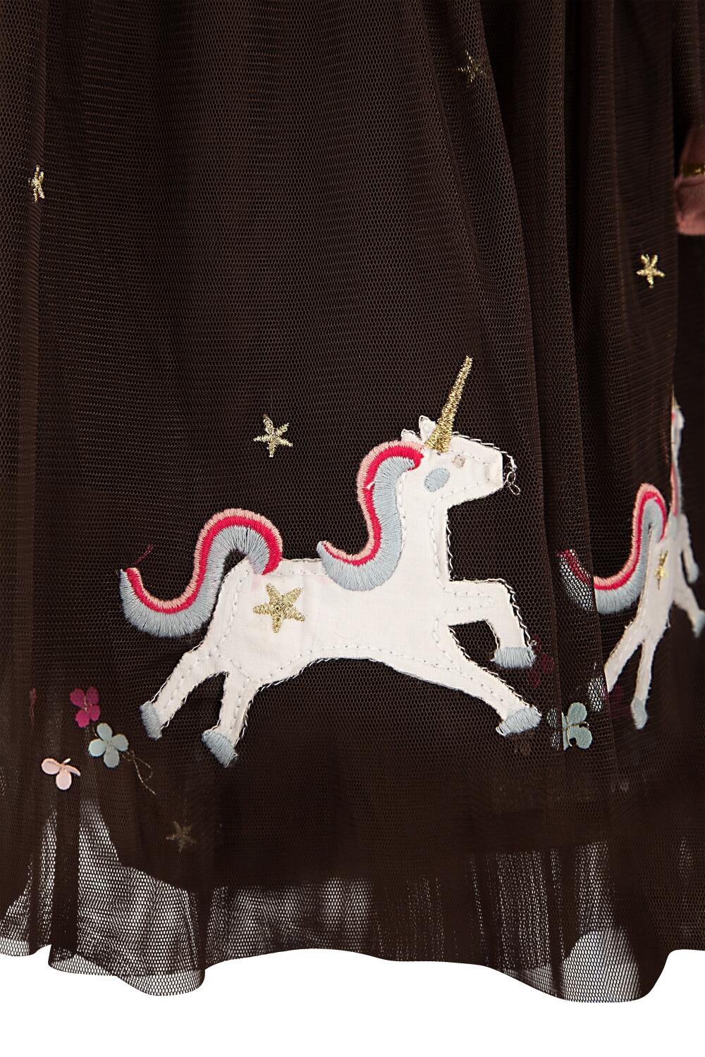 Der angesetzte, dreilagige Rock ist mit Einhörnern und Glitzer-Sternchen bestickt.