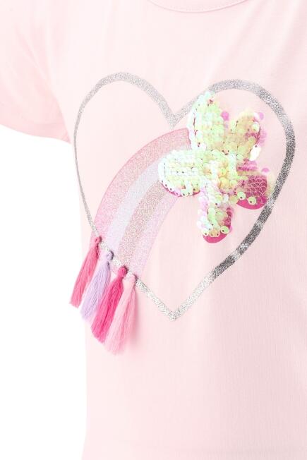 Der vordere Rocksaum ist mit Pailletten-Regenbogen bestickt.