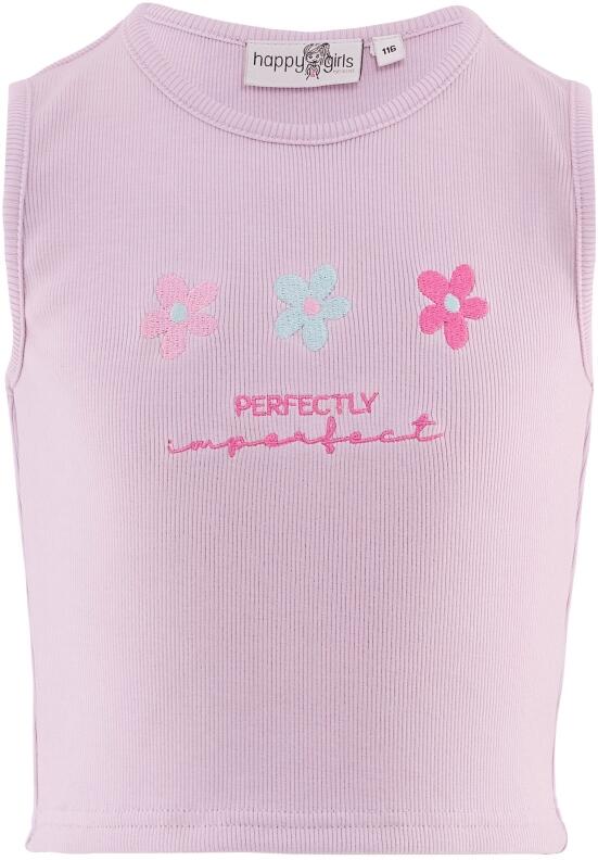 Sommerliches, ärmelloses Feinripp-Shirt mit gestickten Blumen und Schriftzug.