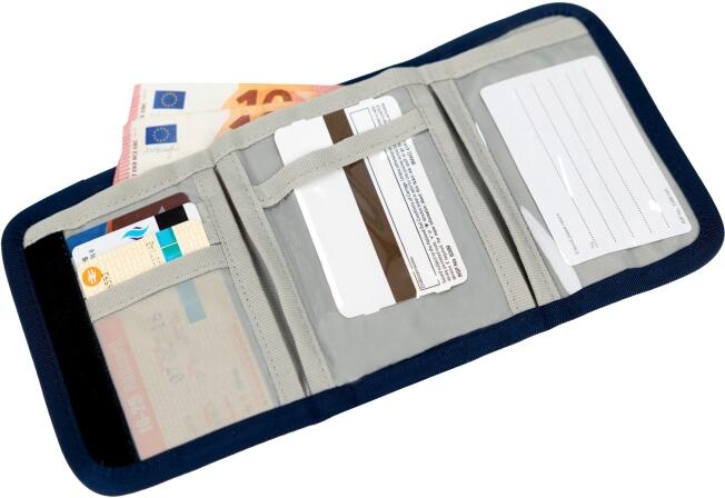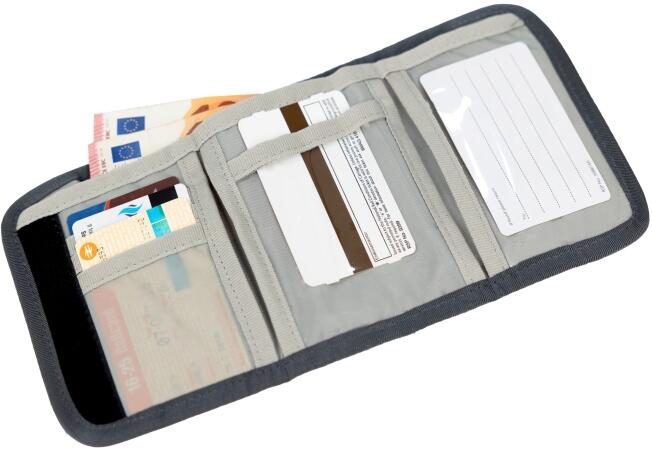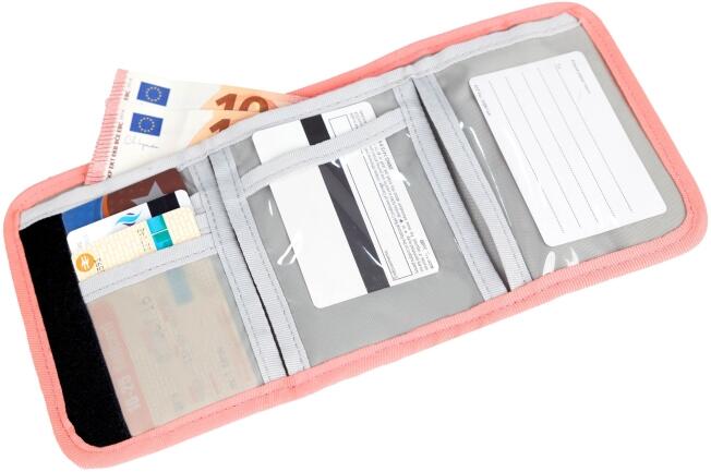 Außen gibt es ein Münzgeldfach mit Reißverschluss, eine Befestigungsöse und ein Klarsichtfach z.B. für Fahrkarten.