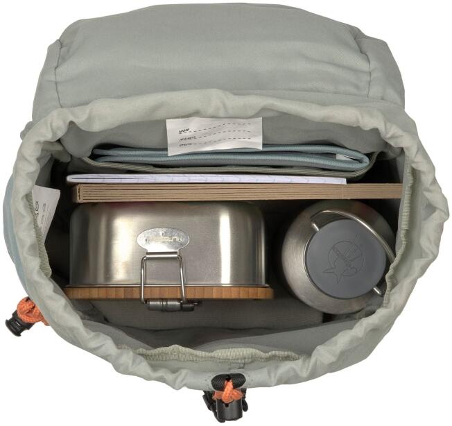 Der geräumige Rucksack hat ein Hauptfach, das mit Kordelverschluss geschlossen wird.