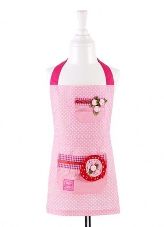 Diese schöne Kinderschürze aus gepunktetem rosa Stoff, verfügt über zwei aufgesetzte Taschen, die mit aufwendigen Applikationen versehen sind.