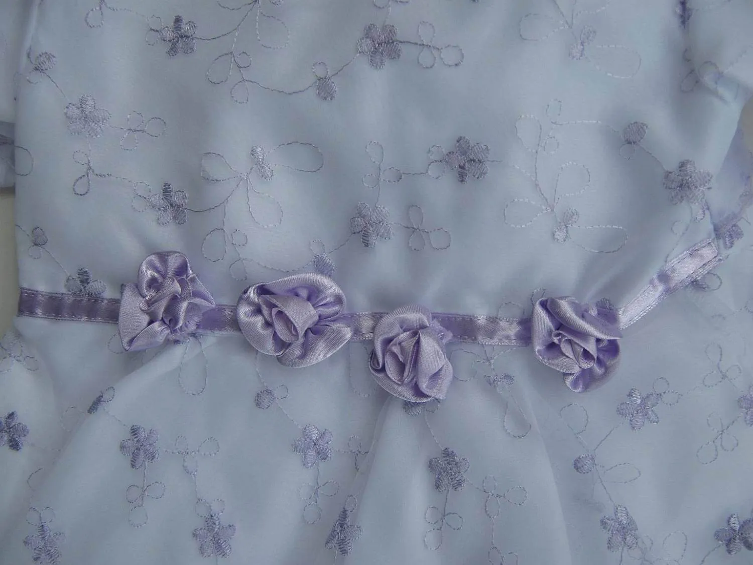 Dieses Satinband finden Sie vorne an der Passe in Form von Applikation und kleinen angenähten Röschen wieder.